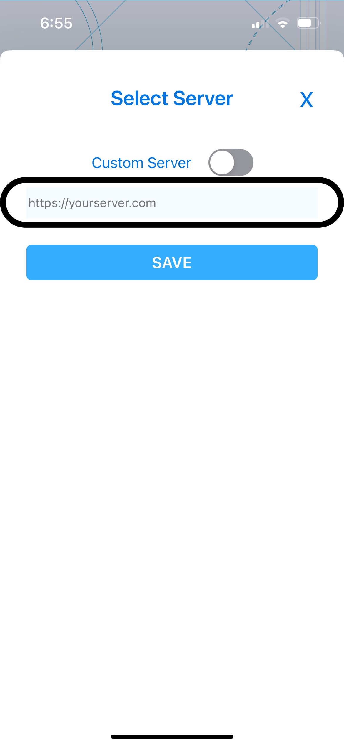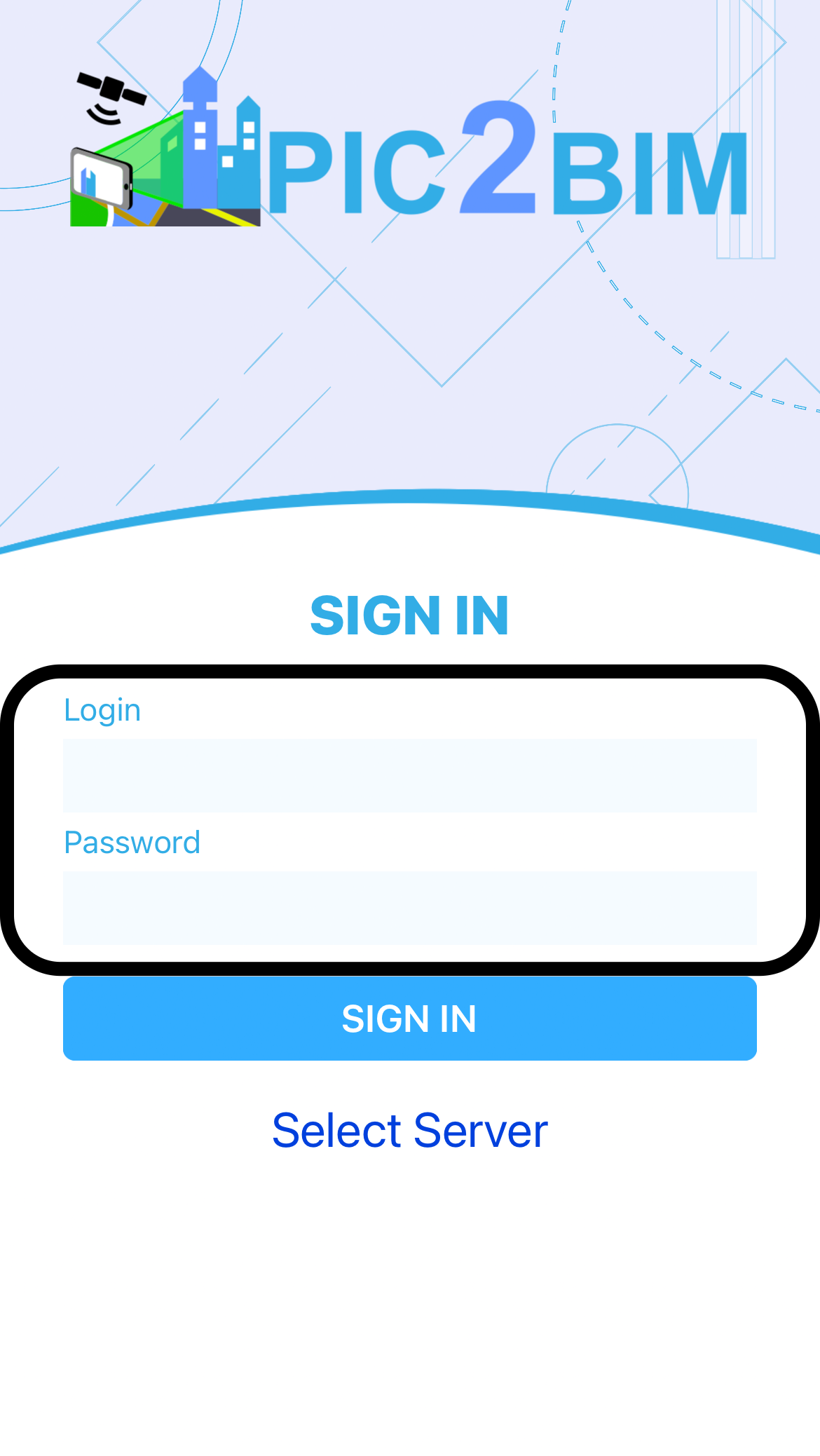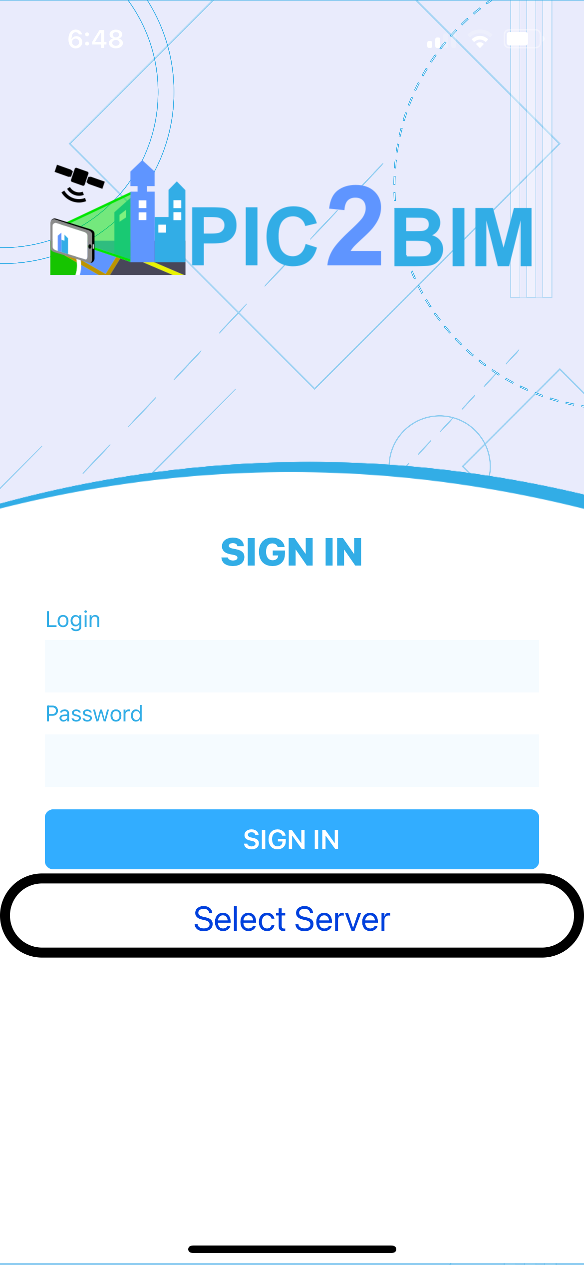 If you need to connect to a custom GeoBIM Portal, tap Select Server, enter the GeoBIM Portal URL (for example, http://192.168.1.xxx), and tap Save.