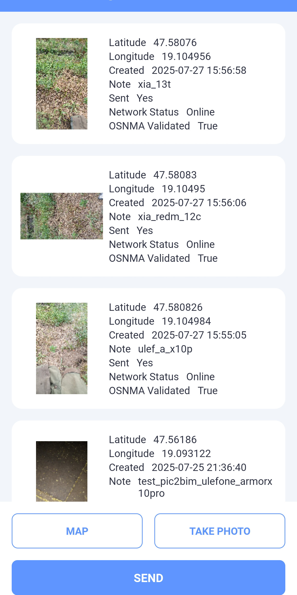 Click the SEND button to upload all newly taken, unsent photos to the GeoBIM Portal. The MAP button displays these photos in the map view.